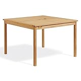 The 42-inch square dining table makes a perfect match to either our Chadwick or Classic arm chairs or side chairs.To allow rain to pass through the table top is slatted.With four untappered legs, very strong pre-mounted hardware to attach the legs, and extra support for the table top, this table is verysturdy.If you choose to use an umbrella simply knock out the 2-inch-diameter solid wood market umbrella plug.This table is made of shorea, a teak family wood that is more dense and heavy than teak.Shorea requires no finishing and will not rot when left outdoors where rain and sun will damage other lesser quality woods.Left untreated, shorea will weather to a soft warm shade of gray similar to the weathering of teak.Sturdy mortise and tenon construction provides the highest quality joinery that will last for many years.Original color can be maintained by applying a seasonal coat of teak oil.