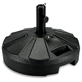 (More customer reviews)First, the holes in this item do not line up so we couldn't use screws to secure the pole section.Because there were open holes, we had to use duct tape to cover them so the sand wouldn't leak out.Then, within a week of use (and while the umbrella it was holding was CLOSED), the wind (on a sunny afternoon- not even storm-strength wind!) dragged this item across our patio- about 8 feet.In that 8 feet, several holes were worn in the bottom of the base before it tipped and cracked in half- so it is unable to hold sand any longer.We had a second umbrella in an older stand in the same area and that one stayed completely still.Find something else to hold your umbrella!!